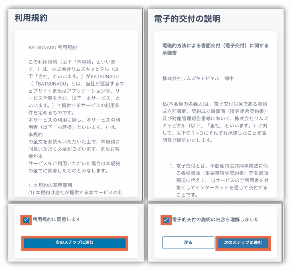 次に利用規約を確認して、同意のチェックを入れてから「次のステップに進む」をタップ。