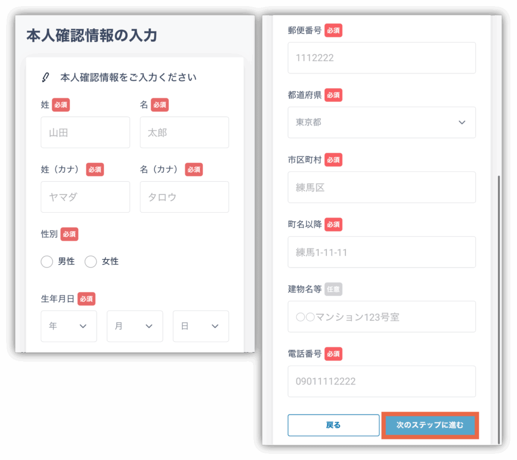 氏名や性別、住所などの基本情報を入力して「次のステップに進む」をタップ。