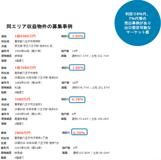 投資対象があるエリアでの売却事例を見てみると、築年数や駅からの距離などは違うけれど、利回りが6~7%台後半で取引されていることが多いよ😳