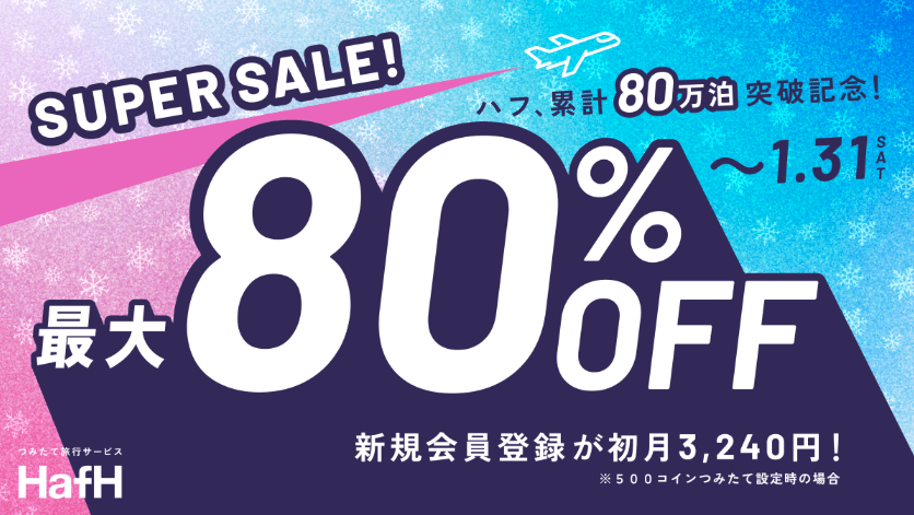 現在、HafHでは2025年12月15日から2026年1月31日までの期間で、累計80万泊突破記念キャンペーンを開催中✨