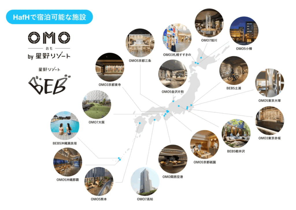 まず、HafHで泊まれる星野リゾート系列のホテルは、これぐらいあるよ(2023年3月時点)✨