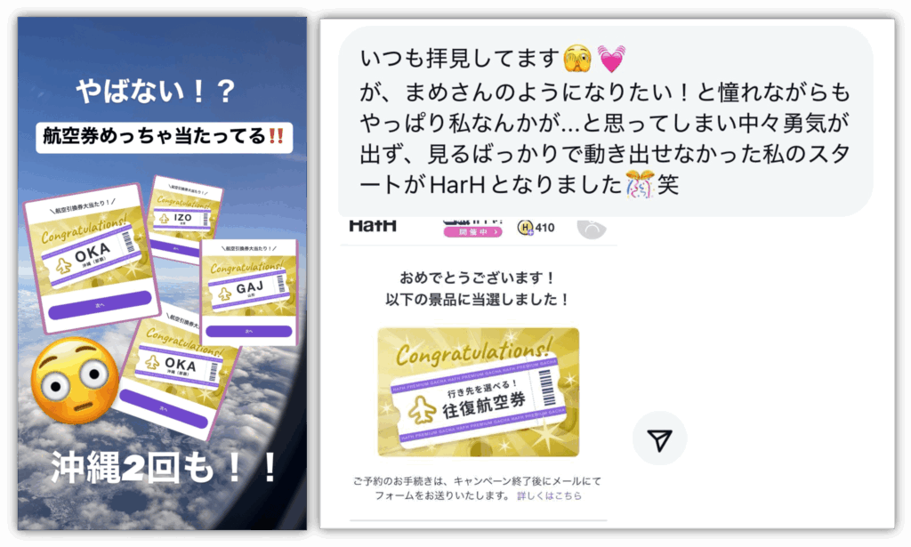 実際に私やフォロワーさんも、このガチャで当たって飛行機にタダで乗れている🥰