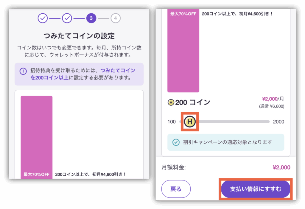 つみたてコイン数は、100〜2,000コインの間で50コイン刻みで自由に設定できる👛