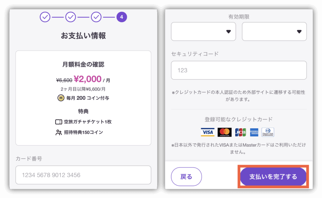 最後に、クレジットカード情報を入力して「支払いを完了する」をタップしよう❣️