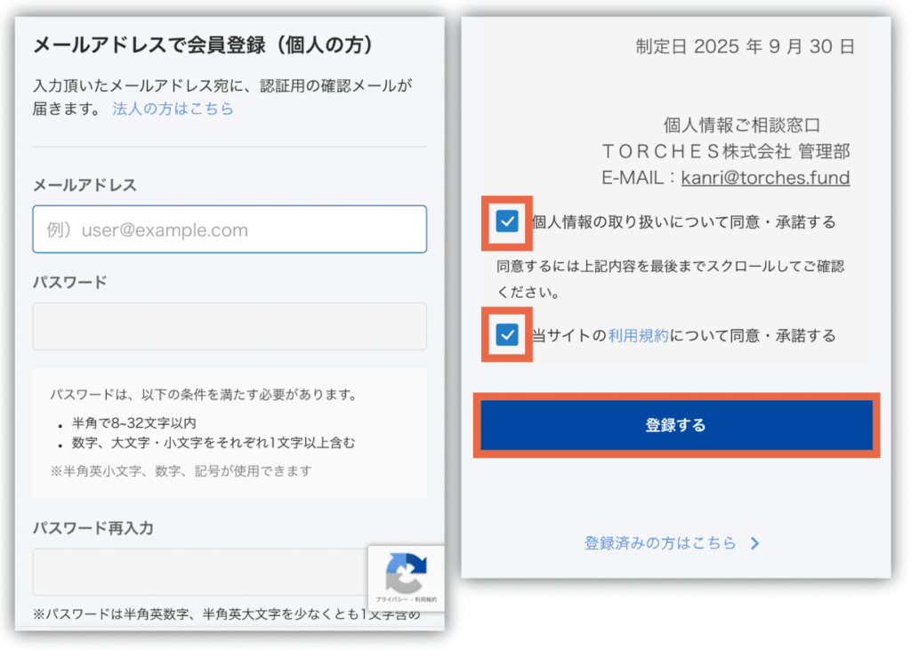 メールアドレスとパスワードを入力して、個人情報の取り扱いと利用規約を確認したら「登録する」をタップしてね🥰