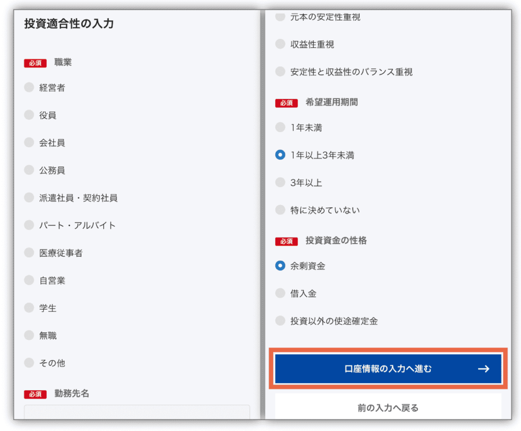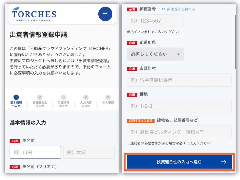 名前から住所まで入力したら、「投資適合性の入力へ進む」をタップ!