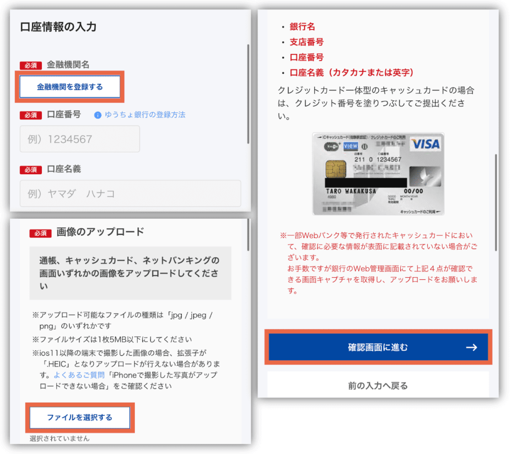 職業から順番に入力したら「口座情報の入力へ進む」をタップしてね🧡