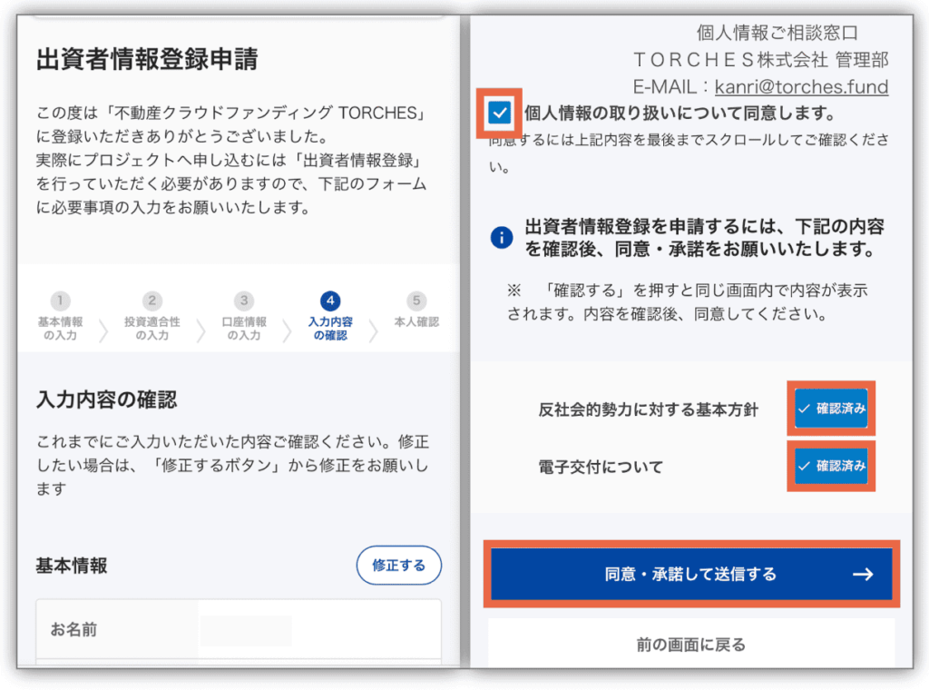 個人情報の取り扱いなどの書類を読んだら、3つにチェックを入れて「同意・承認して送信する」をタップ。