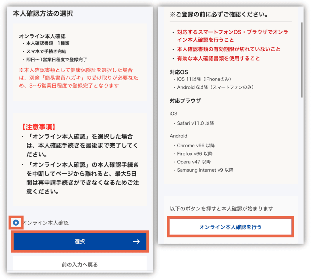 「オンライン本人確認」にチェックを入れたら「選択」をタップしてね。