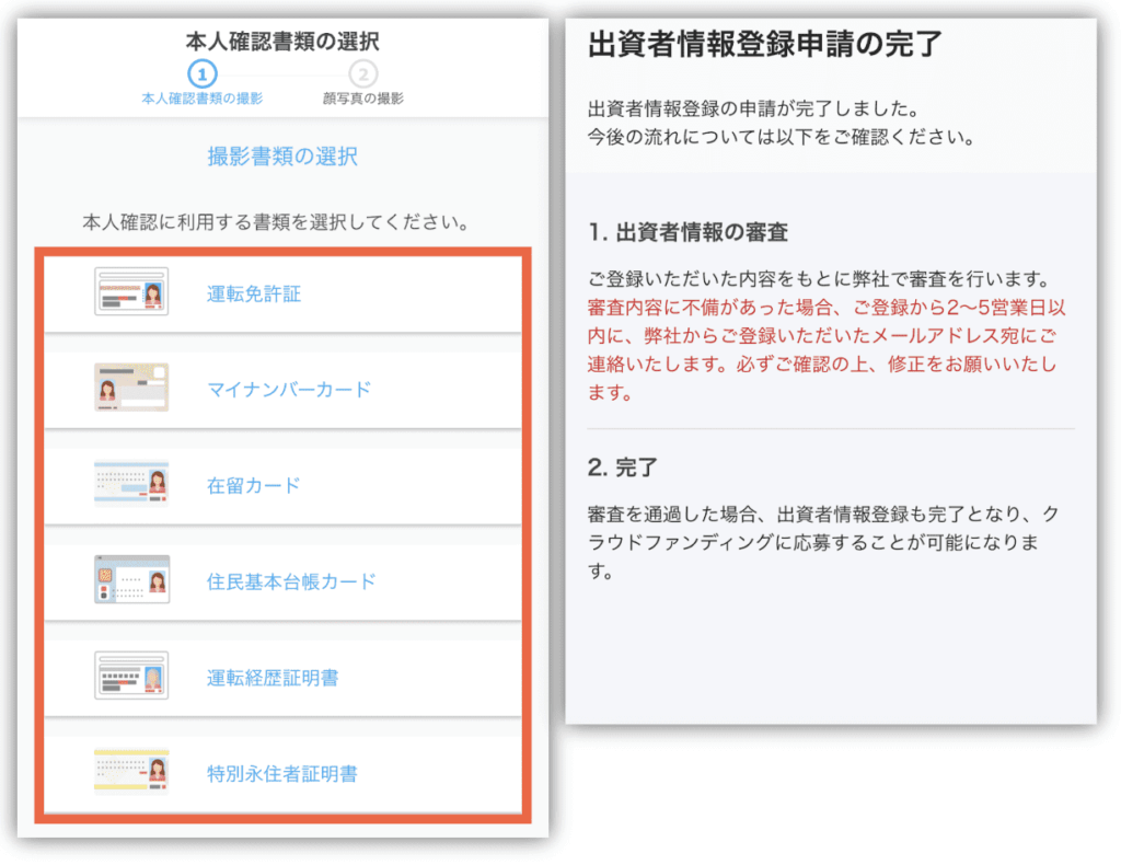 全ての撮影が終わると、「出資者情報登録申請の完了」が表示されるよ✨