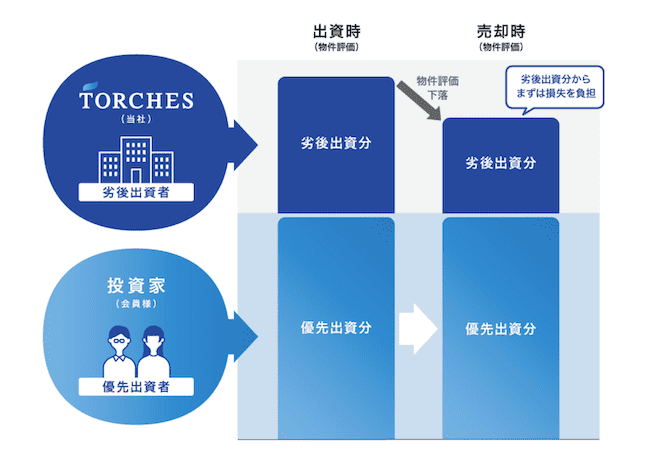 トーチーズは「優先劣後構造」を取り入れて、元本割れのリスクを減らしているよ。